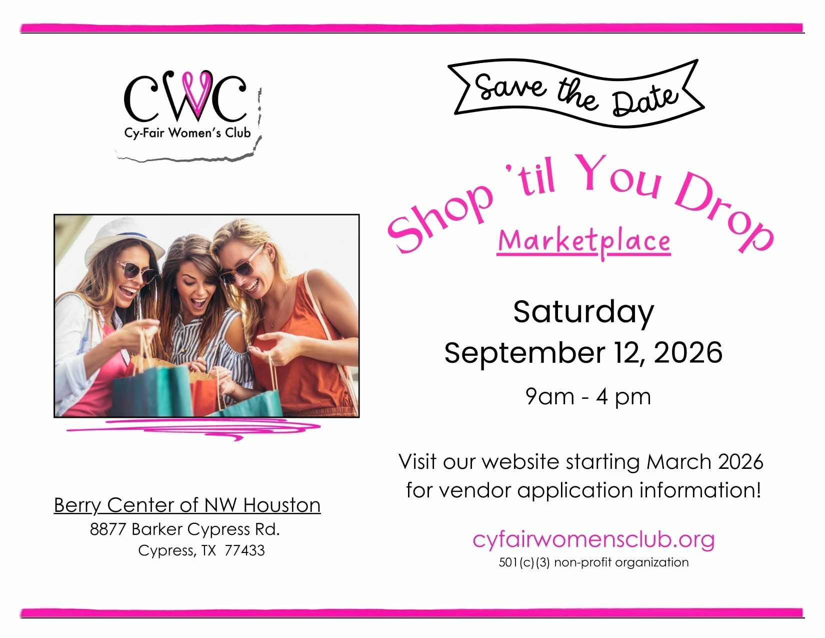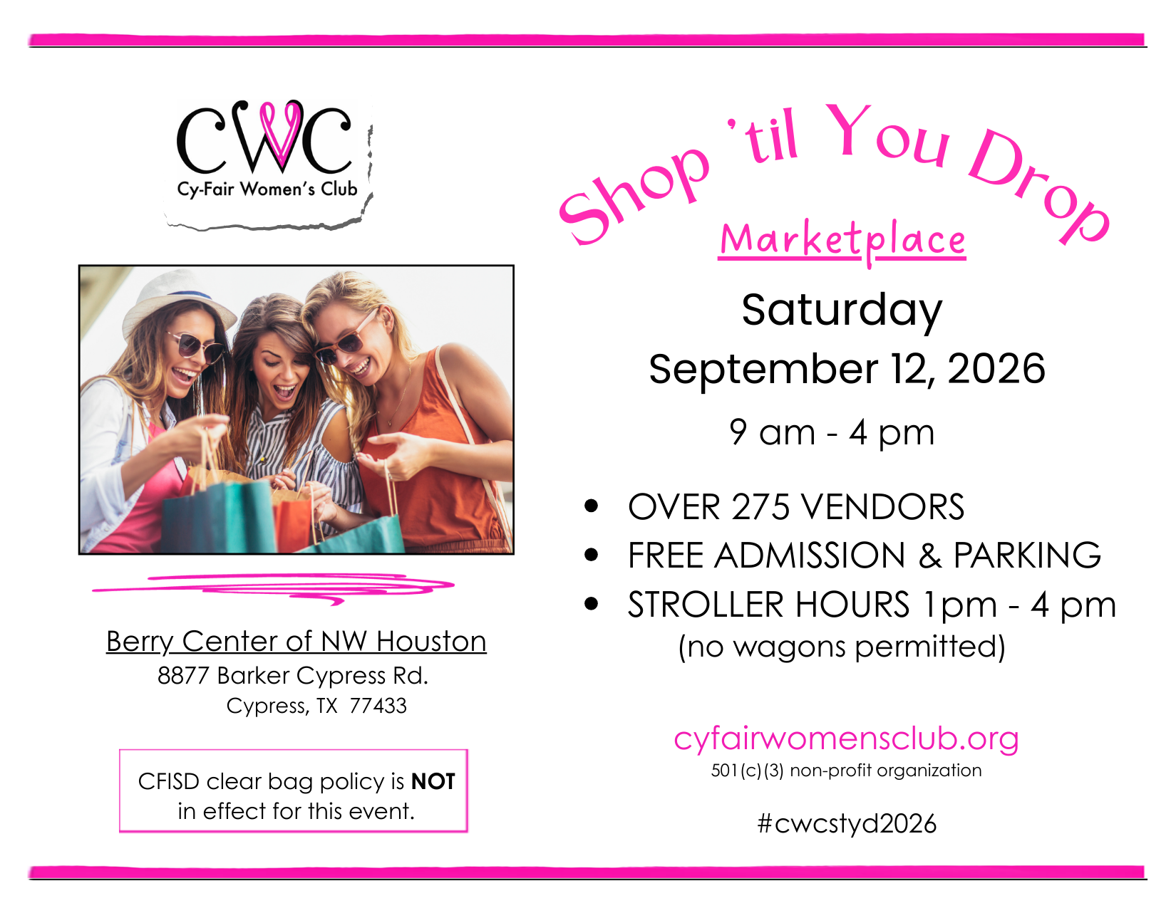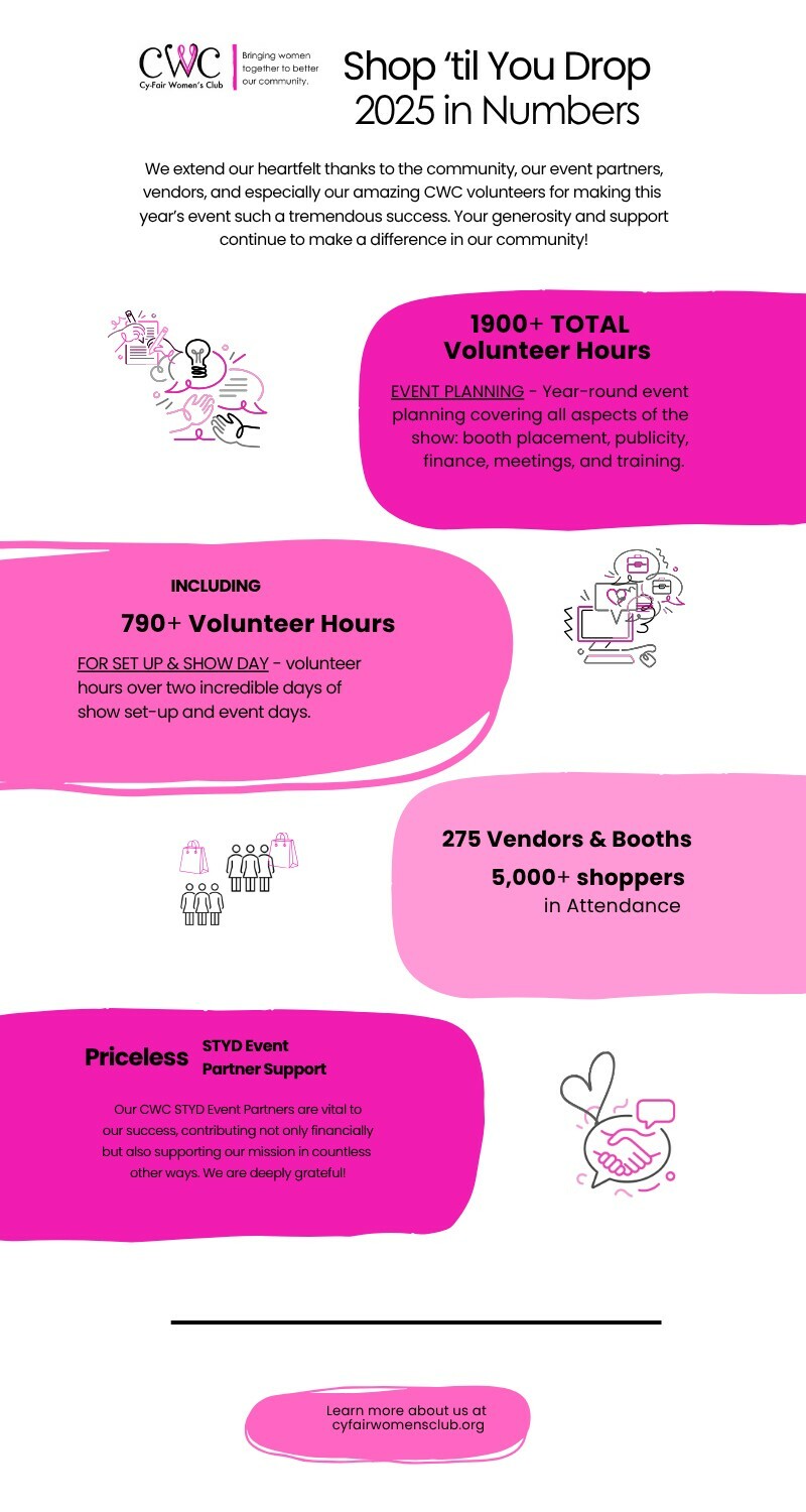 is Cy-Fair Women's Club's largest annual fundraiser, featuring 275+ vendors and drawing over 5,500 shoppers. Entirely run by CWC members, community partners, supporters, and student volunteers.